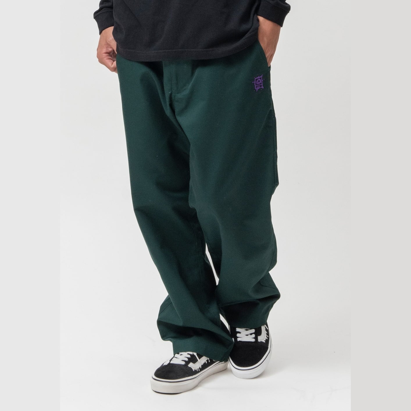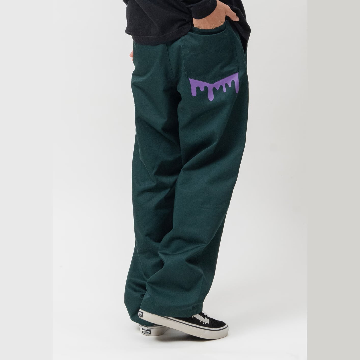 TURQUOISE GREENにはPURPLEを合わせ、さりげないアクセントに。